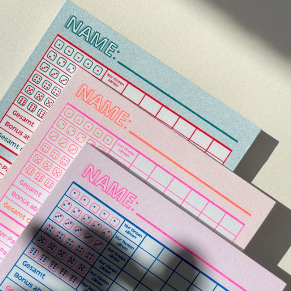 Riso-gedruckter Kniffel-Spieleblock zu fünfzig Blatt, für viele Spielrunden!